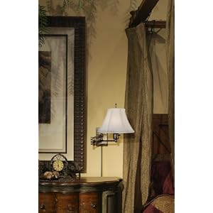 The uncomplicated styling and emphasis on function lend this swing arm wall lamp a comfortable, old-school feel. Features include a smooth, antique empire brass finish and a charming ivory bell shade. Plug-in design is simple; just attach lamp base to wall and plug it into a standard wall outlet. Cord cover not included.