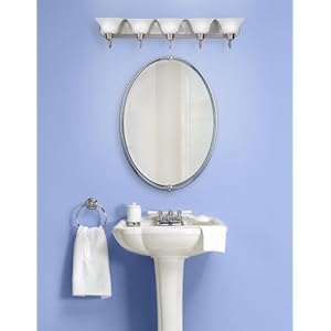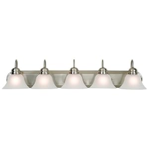 A classic, minimal bathroom light fixture style. Five lamps provide ample lighting and make this piece a natural for bath or vanity settings.