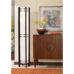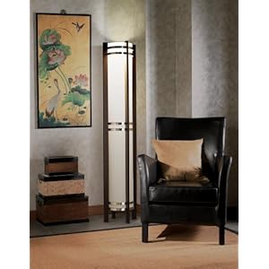This innovative hybrid design offers two lights in one. For starters, a recessed torchiere light with a diffuser at the top provides general room lighting. Next, a set of four bulbs below the torchiere give off warm, diffused accent lighting. Operate both together or use independently of each other to set the mood. The design features dark chocolate finish wood with brushed nickel accents and a linen shade.