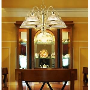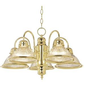 This beautiful chandelier is the perfect touch in a kitchen or breakfast nook. Polished brass finish with clear rippled glass.
