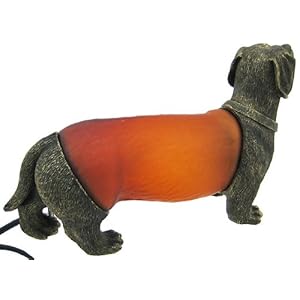 This incredibly cute Dachshund lamp is made of bronze looking metal, with a midsection of amber stained glass to give off soft light. The lamp is 6 1/2 inches tall, 11 inches long and 3 1/2 inches deep, making it a perfect accent for end tables and nightstands. It takes one nightlight style bulb (included) The back of the dog removes easily for simple bulb replacement. It comes with a 6 foot light cord, containing the on/off switch.The lamp is brand new, never used or displayed. It's a perfect gift for any dog lover. We have a very limited supply of these, so don't miss out! Get yours now!